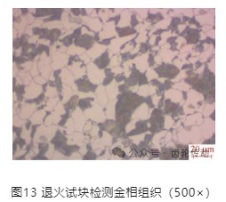 6)切開試塊檢測(cè)金相組織,結(jié)果如圖13所示。從圖13可看出,退火組織正常,雖然稍微有點(diǎn)混晶,但應(yīng)該不是最大原因,也有可能是退火改善了組織。