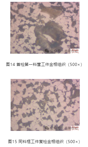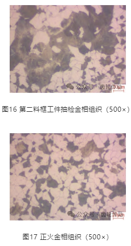 隨后對(duì)正火工序進(jìn)行調(diào)查,發(fā)現(xiàn)這個(gè)產(chǎn)品由 2個(gè)公司進(jìn)行正火處理,一個(gè)是外協(xié)定點(diǎn)公司,一個(gè)是公司內(nèi)部。通過對(duì)公司內(nèi)部工件正火質(zhì)量進(jìn)行調(diào)查,發(fā)現(xiàn)鋼材爐號(hào)是0015728Z,顯示正火混晶,同時(shí)發(fā)現(xiàn)外協(xié)件也是同爐號(hào)產(chǎn)品。公司內(nèi)部正火產(chǎn)品還處于毛坯狀態(tài),沒有轉(zhuǎn)入生產(chǎn)線也沒有返修。首檢第一料筐工件金相組織如圖14所示,硬度177 ~179HBW,局部混晶,不合格,復(fù)檢第一料框工件金相組織如圖15所示,硬度166~167HBW,合格。第二料框工件抽檢金相組織如圖16所示,硬度 170~173HBW,金相組織局部混晶,不合格。由于同是一個(gè)鋼材爐號(hào)的產(chǎn)品,正火有的工件合格,有的工件不合格,因此為了驗(yàn)證本批次工件變形是否與正火有關(guān),對(duì)于公司內(nèi)部正火的產(chǎn)品全部進(jìn)行二次正火。正火金相組織如圖17所示,硬度170~ 173HBW,金相組織、硬度均合格。對(duì)于公司內(nèi)部經(jīng)過二次正火的工件進(jìn)行滲碳淬火,經(jīng)磨齒后,質(zhì)量恢復(fù)正常,沒有出現(xiàn)批量的廢品,同時(shí)也驗(yàn)證了正火組織出現(xiàn)粒貝組織,混晶對(duì)熱處理變形是有影響的。