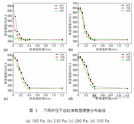 圖 3(b) 為爐壓 230 Pa 時輪齒的滲氮情況,可以看出,齒頂和節圓表面硬度分別為 647 HV0.3 和 638 HV0.3 ,距表面0.1 mm 處硬度可以達到651 HV0.3 和 633 HV0.3,同位置節圓處比齒頂處稍低,但齒根距表面 0.1 mm 處只有 545 HV0.3,與齒頂與節圓處仍有較大差距。圖3(c)為爐壓 280 Pa 時輪齒的滲氮情況,可以看到,齒頂和節圓距表面 0.1 mm 處硬度均可以達到 625 HV0.3 左右,而齒根同位置達到了 610 HV0.3 左右,整個輪齒的滲層深度較均勻,也大大降低了齒根處的硬度梯度。圖 3(d)為爐壓 330 Pa 時輪齒的滲氮情況,可以看到,齒頂和節圓距表面 0.1 mm 處硬度均可以達到 630 HV0.3 左右,而齒根同位置達到了 620 HV0.3 左右,整個輪齒的滲層深度非常均勻。
