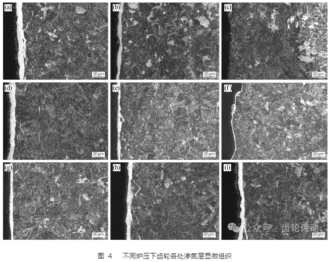 圖 4(g~i)為爐壓為 330 Pa 時,輪齒各處的滲氮層顯微組織??梢钥吹?,在齒頂處的白亮層和 230 Pa 和 280 Pa 時相比,稍有減薄,約為 7 μm,在節圓和齒根處白亮層厚度和 230 Pa 和 280 Pa 時相比,明顯增加,約為 8 μm。齒頂、節圓、齒根處的化合物層中疏松級別皆為 1 級;在齒頂和節圓處脈狀氮化物約為 2 級,且在齒根處也出現了微量的脈狀氮化物。