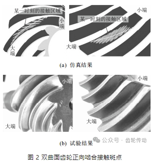 1)齒輪嚙合時,某一時刻齒面接觸區域近似為橢圓形,在嚙合過程中,橢圓形的接觸面積先增大后減小;齒輪正向嚙合時,大小齒輪都是從大端嚙入,從小端嚙出,反向嚙合時相反。