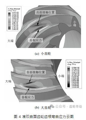 2)大小齒輪齒根危險點均主要承受拉應力,小齒輪危險點先承受拉應力,再承受壓應力,而大齒輪危險點則相反。