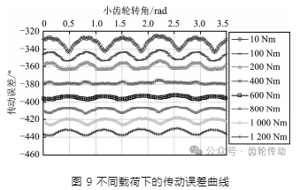 仿真不同載荷下的準雙曲面齒輪的傳動誤差曲線,如圖 9 所示,每條曲線代表不同的負載轉矩。隨著負載轉矩的增加,傳動誤差曲線整體向下平移。當負載轉矩為 10 Nm 時,傳動誤差曲線為上凸的拋物線形狀,小齒輪每轉過一個齒,傳動誤差會出現一次峰值。當負載轉矩小于 400 Nm 時,所有傳動誤差曲線的峰值所對應的小齒輪角位移是相同的,只是傳動誤差的幅值隨著負載轉矩的增加而逐漸減小。說明負載轉矩在 400 Nm 以內時,隨著負載轉矩的增加齒輪傳動越來越平穩。
