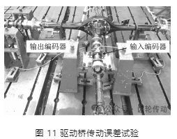 圖 11 是驅動橋傳動誤差的現場試驗圖,參考驅動橋在整車上的安裝狀態,固定驅動橋板簧座位置。對于沒有差速器鎖止機構的驅動橋,在臺架試驗時無法保證兩半軸的角位移完全一致,即使兩側半軸的轉速相同,差速器內部的行星齒輪會發生微小的轉動,也會導致傳動誤差無法測量。因此,將差速器內部的行星齒輪和半軸齒輪焊接在一起,使得差速器失去差速作用,兩側半軸的轉角保持一致。