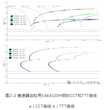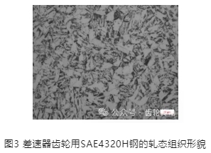 下圖3是500倍下熱軋態齒輪用SAE4320H鋼觀察得到的金相圖,鐵素體晶粒分布較為均勻,其中貝氏體呈現羽毛狀是因為該鋼種在設計時添加了一定的 Si、Al 和 Ni 元素,延緩了鐵素體相、珠光體相的析出,在TTT曲線圖中體現為擴展了貝氏體相的轉變區,也就是在熱軋態就可以得到大量的上貝氏體組織。