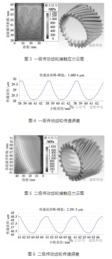 基于 MASTA 的減速器嚙合仿真結(jié)果分別如圖3~圖6所示。減速器一級(jí)與二級(jí)傳動(dòng)齒輪最大接觸應(yīng)力分別為1290和1856MPa,最大傳遞誤差波動(dòng)幅值分別為1.6894和2.2915 μm,齒面接觸斑點(diǎn)接近齒根。