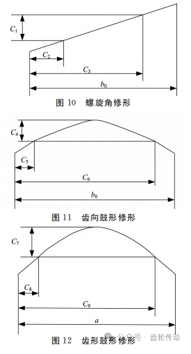 根據(jù)上文仿真結(jié)果,該減速器在預(yù)定工況下存在接觸應(yīng)力集中及傳遞誤差過大的情況,本文為優(yōu)化以上問題,以減小傳遞誤差與接觸應(yīng)力為目的,對(duì)齒面進(jìn)行綜合修形設(shè)計(jì),采用了齒向螺旋角修形、齒向鼓形修形及齒形鼓形修形。其中,螺旋角修形采用直線修形,齒向鼓形修形采用二次拋物線修形,其均為在齒寬方向?qū)X輪齒面進(jìn)行微觀修整,通過修形可以補(bǔ)償齒輪嚙合中齒寬方向存在的嚙合誤差,從而改善齒輪在齒寬方向上應(yīng)力集中問題。齒形鼓形修形采用二次拋物線修形,其為沿齒廓線進(jìn)行齒形微觀修整,從而人為彌補(bǔ)齒輪實(shí)際嚙合時(shí)齒輪的受載變形及安裝誤差等,避免沖擊,減小傳遞誤差,改善齒輪的偏載情況。修形曲線如圖10~圖12所示。圖中,C1 與C2 、C3 為螺旋角修形量與修形范圍,C4 與C5 、C6 為齒向鼓形修形量與修形范圍,C7與C8、C9 為齒形鼓形修形量與修形范圍,b0 為齒寬,a為齒廓線的長(zhǎng)度。