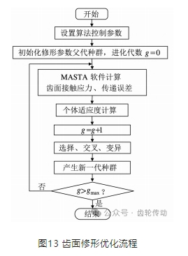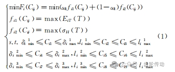 式中,F(xiàn)i (Cij)為i級(jí)小齒輪修形目標(biāo)函數(shù);ωi 為i 級(jí)小齒輪權(quán)重因子,取0.5;fi1 (Cij)、fi2 (Cij)分別表示i級(jí)修形小齒輪在最大正驅(qū)工況下負(fù)載扭矩為T 的傳遞誤差波動(dòng)幅值和齒面接觸應(yīng)力最大值; δi1 min 、δi1max 分別表示i級(jí)小齒輪螺旋角修形量的極小值、極大值;li1min 、li1max 分別表示i級(jí)小齒輪螺旋角修形范圍的極小值、極大值;δi2min 、δi2max 分別表示i級(jí)小齒輪齒向鼓形修形量的極小值、極大值; li2min 、li2max 分別表示i級(jí)小齒輪齒向鼓形修形范圍的極小值、極大值;δi3min 、δi3max 分別表示i級(jí)小齒輪齒形鼓形修形量的極小值、極大值;li3min 、li3max 分別表示i級(jí)小齒輪齒形鼓形修形范圍的極小值、極大值。