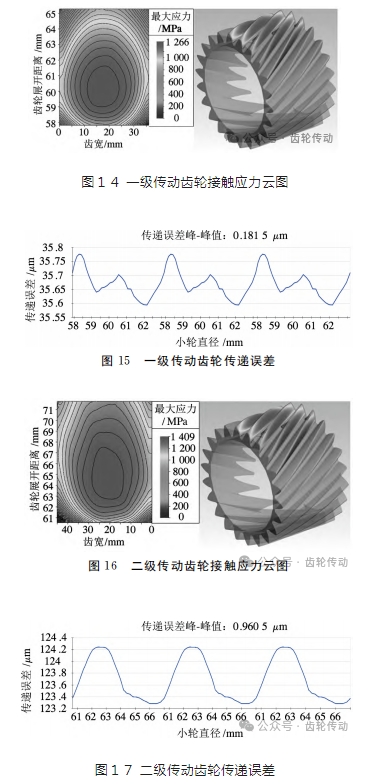 對(duì)上述優(yōu)化模型進(jìn)行求解,優(yōu)化獲得的各級(jí)齒輪副小輪齒面修形參數(shù)為:C11 =0、C12 =0、C13 = 0、C14 =10、C15 =0、C16 =38、C17 =10、C18 =57. 609、C19 =66.29、C21 =-14.0、C22 =0、C23 =47、C24 =15、C25 =0、C26 =47、C27 =15、C28 =60.267、 C29 =71.76。對(duì)修形后減速器模型進(jìn)行仿真分析,仿真結(jié)果如圖14~圖17所示,通過齒面修形優(yōu)化,減速器一級(jí)與二級(jí)傳動(dòng)齒輪最大接觸應(yīng)力減小為1 266和1409MPa,分別下降了1.86%和24.08%,最大傳遞誤差波動(dòng)幅值分別為0.1815和0.9605μm,分別下降了89.26%和58.08%,齒面接觸斑點(diǎn)均勻分布,減速器應(yīng)力集中與偏載問題得到了有效改善,嚙合性能得到了有效改善。