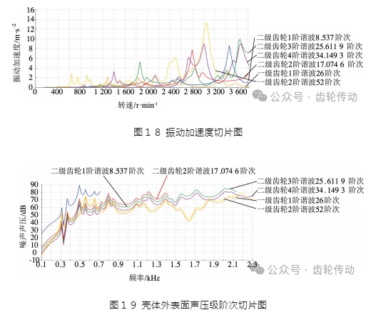 3)振動(dòng)噪聲仿真分析表明:通過齒面修形,減速箱殼體外表面26階1285r/min振動(dòng)加速度減小了 95.15%,26 階 556.5 Hz 頻率處聲壓級(jí)減小了 26.15%,8.537階492.8 Hz頻率處聲壓級(jí)減小了 7.97%,該齒面優(yōu)化方案對(duì)減振降噪具有較好的效果。