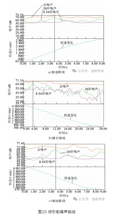 1)修形前噪聲曲線如圖20所示,減速器傳動(dòng)系統(tǒng)加速、滑行以及制動(dòng)階段的一級(jí)傳動(dòng)齒輪26階噪聲由68.16、68.04和68.07dB降低為47.51、63.20和58.37dB,分別降低了30.30%、7.11%和14.25%,一級(jí)傳動(dòng)齒輪噪聲得到了明顯改善。