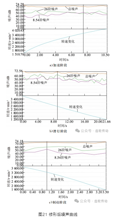 2)修形后噪聲曲線如圖21所示,減速器傳動(dòng)系統(tǒng)加速、滑行以及制動(dòng)階段的二級(jí)傳動(dòng)齒輪8.54階噪聲由 52.26、52.24 和 52.26dB 降低為 51.53、52.02和51.65dB,分別降低了1.39%、0.42%和 1.17%,二級(jí)傳動(dòng)齒輪噪聲也有了一定改善。