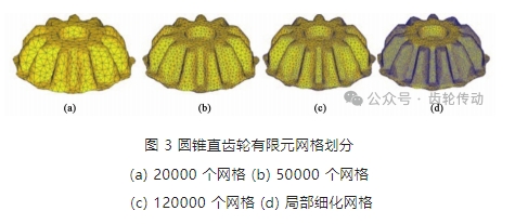 網格劃分是對幾何模型進行離散化處理, 是有限元前處理過程中的重要環節, 合理的網格劃分能夠保證計算結果準確性。齒輪形狀復雜, 增加網格單元數量可以更好地描述齒輪表面, 增加模擬結果的準確性, 但是隨著網格數量的增加, 會花費大量的模擬時間; 而網格單元數太少, 一方面會導致最終成形的零件的形狀很差, 另一方面會由于網格畸變而導致計算失敗, 因此需要合理劃分齒輪網格數量。如圖 3a~圖 3c 所示, 均勻劃分網格時, 隨著網格數量增多, 齒形模擬成形的質量較好, 但是齒輪精密塑性成形時, 齒形部分是塑性變形的大變形區也是齒輪成形過程中重點研究的區域, 而中間部分材料的變形很小且近似于作剛性移動。因此, 可采用局部細化網格的方法, 對齒形部分劃分較密的網格, 而對中間變形較小的坯料設置較稀疏的網格, 如圖 3d 所示。