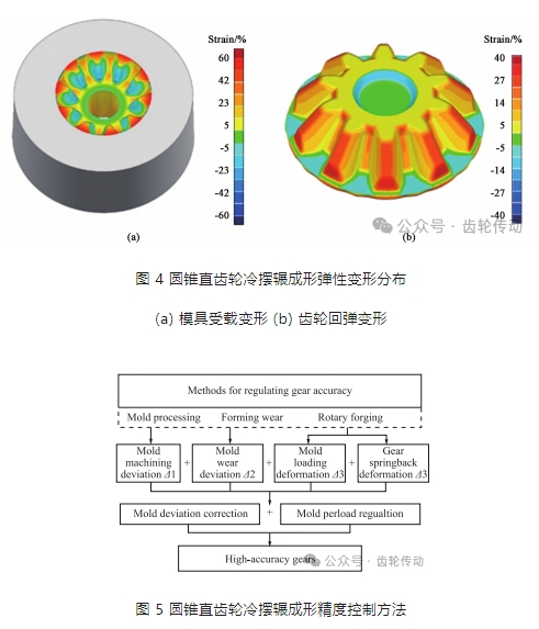 武漢理工大學華林教授團隊提出用齒面綜合偏差來評價圓錐直齒輪冷擺輾變形齒形精度, 通過建立圓錐直齒輪冷擺輾變形彈塑性有限元模型, 分析得到圓錐直齒輪冷擺輾成形過程中齒形凹模受載產生的彈性變形以及成形齒輪回彈變形的分布, 如圖 4 所示。根據圓錐齒輪冷擺輾變形過程中影響齒形精度的因素, 結合彈塑性有限元理論揭示圓錐直齒輪冷擺輾模具加工精度-模具彈性變形-齒輪成形精度之間的傳遞規律, 從而建立了圓錐直齒輪冷擺輾成形精度預測模型, 如式 (1) 所示; 還提出了基于模具加工-模具預緊-冷擺輾工藝參數協同調控的直齒錐齒輪冷擺輾成形精度控制新方法, 如圖 5 所示。