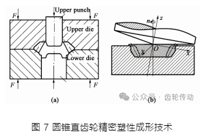 熱精鍛技術是將坯料加熱到再結晶溫度以上, 在模具作用下坯料發生塑性變形填充型腔成形零件的技術。熱精鍛成形材料變形抗力低、塑性好, 容易成形比較復雜的工件。齒輪熱精鍛技術源于 20 世 紀 50 年代, 是由德國人最先開始用閉式熱模鍛方法成形圓錐直齒輪。圓錐直齒輪是一種能夠傳遞相交軸間運動和扭矩的重要傳動零件, 具有高效、穩定及噪聲小等優點, 在汽車、機床等領域有著廣泛的應用。由于圓錐直齒輪齒形在背錐上, 相對于其他類型齒輪成形好, 是國內外學者研究最早、發展最快、最先實現塑性成形的一類齒輪, 圖 7 所示為圓錐直齒輪精密塑性成形技術。