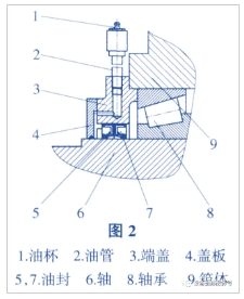 圖2中,單唇油封5和7面對面安裝。蓋板4內徑與軸6外徑之間保持小間隙,以阻止大顆粒雜物的進入。定期從油杯1處注入的油脂可以潤滑油封5的主唇口,同時阻止雜物從蓋板4內孔與軸6之間進入。