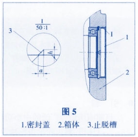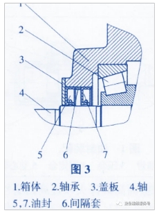 圖3中,蓋板3內孔與軸4之間的間隙很小,以阻止大顆粒雜物的進入。油封5為雙唇油封,用于阻止從蓋板3與軸4之間進入的雜物,油封7為單唇油封,兩油封間注入潤滑脂以潤滑油封唇口并阻隔雜物。