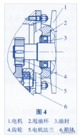 圖4為高速軸密封結構,齒輪4轉速在1500r/min以上,齒輪4甩出的潤滑油溫度高并夾雜異物,以較大的壓力打擊在油封3的唇口,對油封唇口甚至軸上的油封檔損害很大。安裝甩油環2后,齒輪4甩}n的潤滑油不能直接打擊油封3的唇口,消除了對油封唇口的損害。使用甩油環后,由于高速軸油封的失效不再出現,印證了甩油環2對油封3的保護作用。圖2和圖3的結構主要是阻止外來異物對油封唇口的損害,圖4是一種高速軸油封保護措施的結構,還有一種情況是在減速機的底部,容易聚集顆粒雜質。這些異物一旦進入油封唇口,就會加速油封唇口和軸的磨損,從而造成滲漏。對于減速機內部的顆粒雜質,改進設計是在油封周圍設置磁鋼,磁鋼固定在放油螺塞上以吸附減速機內部的金屬雜質。