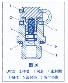 圖7是一種常通式通氣器的代表,通氣孔有朝下的,也有在側邊的,還有迷宮式的。因為是常通式的,所以不符合四大系列減速機對通氣器的要求;圖8的通氣器在運輸時用閥芯堵塞,在使用時將閥芯拔出,成為通式通氣器,運行時水汽、粉塵等容易進入減速機;圖9的通氣器在使用時,減速機內部需要一定的壓力才能開啟,這類通氣器基本符合要求,但在運輸時密封不可靠。某公司通過多年的研究,開發出一款通氣器,如圖10。