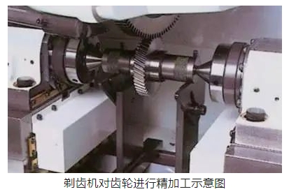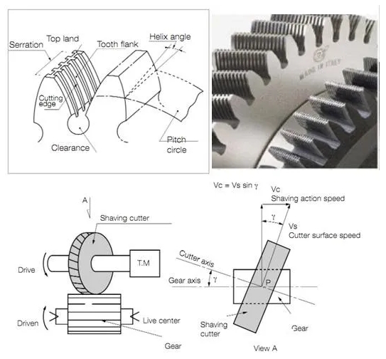 剃齒加工是根據一對螺旋角不等的螺旋齒輪嚙合的原理,利用剃齒刀與齒輪工件的嚙合傳動,從齒輪工件的齒面切削去微小的加工余量,進行剃削。剃齒刀與被切齒輪的軸線空間交叉一個角度,它們的嚙合為無側隙雙面嚙合的自由展成運動。剃齒加工屬于齒輪的精加工,但只能用于非淬硬的齒輪(硬度小于35HRC),通過剃齒加工通常能提高齒輪精度一個等級。