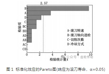 通過16 次實(shí)驗(yàn),將雙切滾刀壽命統(tǒng)計(jì)后經(jīng)過 MINITAB分析所得標(biāo)準(zhǔn)化效應(yīng) Pareto圖如圖 1 所示,圖中橫坐標(biāo)為六西格瑪檢驗(yàn)統(tǒng)計(jì)量t值,分界線為依據(jù)選定的顯著性水平α=0.05給出臨界值2.57,超出該值的因子為顯著因子。因子 A 為滾刀轉(zhuǎn)速,B為滾刀軸向進(jìn)給,C為切削次數(shù),D 為冷卻方式,BC為滾刀軸向進(jìn)給和切削次數(shù)交互效應(yīng),BD 為滾刀軸向進(jìn)給和冷卻方式交互效應(yīng),AD 為滾刀轉(zhuǎn)速和冷卻方式交互效應(yīng),AB為滾刀轉(zhuǎn)速和滾刀軸向進(jìn)給交互效應(yīng), AC為滾刀轉(zhuǎn)速和切削次數(shù)交互效應(yīng),CD 為切削次數(shù) 和冷卻方式交互效應(yīng)。從圖1中可以直觀地分析出影 響滾刀壽命的最主要因子為滾刀軸向進(jìn)給,其次為滾 刀轉(zhuǎn)速,而切削次數(shù)和冷卻方式交互效應(yīng)對(duì)滾刀壽命影響最小。
