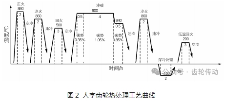 CSS?42L 鋼人字齒輪熱處理工藝主要包括正火、淬火、回火、滲碳、二次淬火、深冷處理、低溫回火等流程,具體熱處理工藝如圖 2 所示。