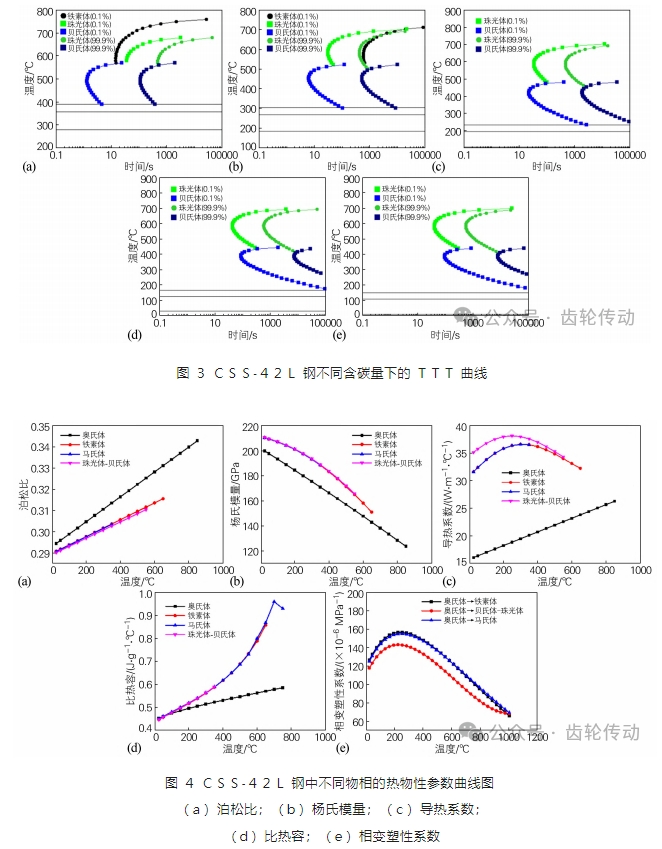 基于 JMatPro 仿真軟件,計算 CSS-42 L鋼在含碳量(質量分數)分別為0.13% 、0.6% 、0.8% 及1.0% 4 種情況下的過冷奧氏體等溫轉變曲線(TTT圖)如圖 3 所示。同時建立 CSS?42L 鋼材料性能參數曲線,其熱物性參數如圖 4 所示。