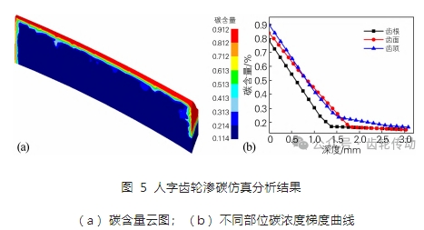 將齒輪模型及 CSS?42L 鋼的熱物性參數導入到 Deform 軟件中進行熱處理仿真分析。圖 5 為人字齒輪切分半齒剖面的碳含量云圖及人字齒輪不同部位碳含量梯度曲線圖,經過完整的滲碳工藝后,齒輪齒頂、齒根及齒面中心點表面的碳含量差異較小,碳含量分布較為穩定。其中:①人字齒輪齒頂部位表面碳含量最高,達到了約 0.9% ,高于齒面中心及齒根表面位置的碳含量,這是由于尖角效應的影響,在加熱過程中,該部位升溫較快,其表面的碳原子最先進入活性狀態,因此導致最終碳含量較高;②人字齒輪齒根位置的碳含量最低,達到了約0.8% ,由于該位置處幾何形狀呈向內凹陷的結構,升溫較慢,且此位置靠近齒輪心部,其表面的碳原子進入活性狀態所需要的時間較長,碳原子擴散速率較低,因此在人字齒輪齒根處的碳含量最低;③由于從人字齒輪齒面到齒輪底面的幾何形狀變化相對較小,此兩處部位的碳原子濃度相近,齒面上的碳含量代表了齒輪大部分區域,達到了約 0.85% 。