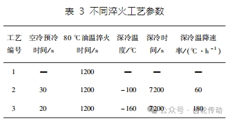淬火工藝是影響人字齒輪輪齒畸變的主要工藝之一,淬火冷卻時長、淬火溫度以及淬火方式均會對人字齒輪熱處理后畸變情況產生較大的影響,因此,通過改變淬火工藝參數來分析不同工藝淬火處理后人字齒輪輪齒畸變情況,表 3 為制定的淬火工藝方案。