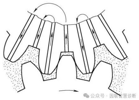 為了減小對泵軸所作用的徑向力,并防止齒輪表面受到剝蝕,必須采取適當的措施。為此,在泵蓋上開有兩條平衡槽(圖4)。當封閉空間由大變小時,被擠壓的液體可沿平衡槽流向排出口。當封閉空間的容積增大時,吸入口的液體可經平衡槽流進封閉空間。此外,還可以采用在從動齒輪上開平衡孔的方法。平衡孔是通過齒頂和齒底鉆通的若干個徑向小孔,如圖 5所示,在與平衡孔同一橫斷面處的從動軸上開兩個凹槽。當封閉空間由大變小時,被擠壓的液體經平衡孔和凹槽流向排出口;封閉空間由小變大時,吸入口中的液體可經小孔和凹槽流進封閉空間。液體的平衡孔中的流動情況如圖6所示。