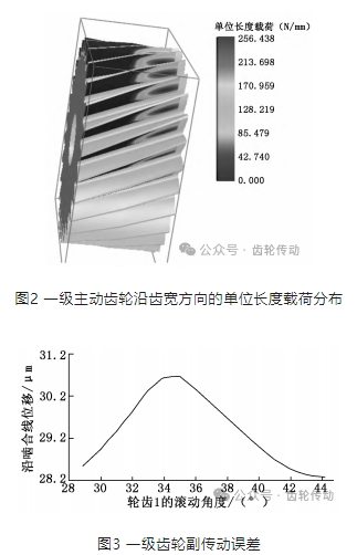 對(duì)齒輪副進(jìn)行仿真分析,得到的一級(jí)主動(dòng)齒輪沿齒寬方向的單位長(zhǎng)度載荷分布如圖2所示,一級(jí)齒輪副傳動(dòng)誤差如圖3所示。