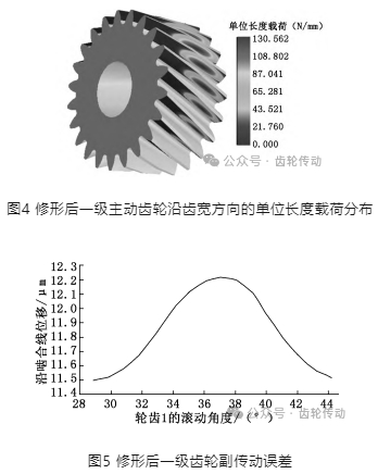 根據(jù)計(jì)算得到的修形量對(duì)主動(dòng)齒輪進(jìn)行參數(shù)設(shè)置, 經(jīng)過分析得到的一級(jí)主動(dòng)齒輪沿齒寬方向的單位長(zhǎng)度載荷分布與一級(jí)齒輪副傳動(dòng)誤差,分別如圖4、圖5所示。