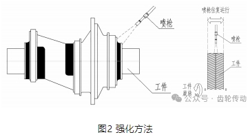 噴槍狀態 - 角度:對于軸類零件圓角,工件水平放置噴槍應成45°垂直圓角噴射。對于齒圈,噴槍成一定角度盡可能垂直齒面進行噴射,以保證彈丸的最大撞擊力,強化方法如圖2所示。