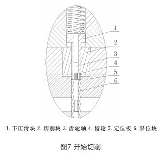 2、如圖8所示,機床繼續(xù)下壓,帶動定位板下降,限位塊連同齒輪則一同頂入切削塊的切削孔內(nèi),這時切削完成,切削廢料則落入切屑回收槽內(nèi)。