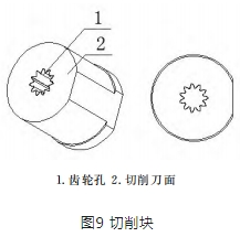 切削塊的結(jié)構(gòu)如圖9所示,齒輪的加工精度主要由切削塊決定,如果切削刃發(fā)生磨損,或齒輪孔內(nèi)壁粗糙等, 都會使齒輪工件表面粗糙,甚至造成齒輪開裂,故要求切削塊具有較高的硬度和粗糙度較低的切削工作面;同時熱塑性材質(zhì)的硬度低,需要的切削力小,所以應(yīng)選擇容易磨出鋒利刀具刃口的刀具材質(zhì),如經(jīng)過淬火的碳素工具鋼、高速鋼、合金工具鋼和鎢鈷類硬質(zhì)合金,需要精密加工時可選金剛石車刀。本夾具切削塊選用鎢鋼(合金工具鋼)制造。