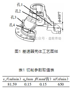 圖 1 所示為差速器殼體的工藝圖樣,車銑復合中心加工十字孔共3道工序, 分別是粗鏜、半精鏜、鉸孔。鉸削4個十字軸孔為最后一道工序,其尺寸及精度要求為:十字孔直徑為φ40 mm,公差等級為P7,表面粗糙度為Rz16 μm,目前使用的切削參數如表1所示。
