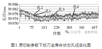 實驗前選取近期加工過程最穩定且刀具使用壽命最長的227型號工件,通過全自動在線綜合量儀采集加工孔徑數據,得到了原有切削參數下鉸刀全壽命狀態孔徑變化圖(如圖3),變化圖的初始階段加工尺寸有明顯的擴大現象,然后孔徑尺寸逐漸減小趨于平穩;第二階段刀具處于加工穩定期,孔徑尺寸基本介于39.972~39.978 mm的范圍內;第三階段孔徑逐漸變大最終超差,鉸刀壽命期加工長度接近500 件,加工總長度不超過100 m。分析刀具全壽命周期的變化情況,初始階段一般情況下刀具較為鋒利,刀具直徑接近上差,而后受安裝跳動的影響,鉸刀會向孔心方向磨損并趨于穩定,圖3中初始階段曲線下降緩慢,明顯表現出的是刀具安裝跳動偏大。第三階段隨著刀具的磨損,刀具的切削刃出現了較嚴重的局部磨損,所以刀刃的切削點會向下偏移,或者存在積屑瘤等問題,刀具非正常切削,摩擦力增大,使得工件孔徑變大。