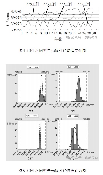 對30件工件做孔徑數據統計,整理出各工件型號的每個工件中4個十字軸孔的平均值曲線,曲線圖展示了不同壁厚的殼體的收縮值有所不同。把不同型號的30件產品的孔徑數據求出4個平均值后,對 4 個平均值再取平均,最終得到孔徑值為39.976 mm。此時,30件產品中孔徑壁厚最薄的229工件加工的上限值為39.984 mm,而孔徑壁厚最厚的232工件加工的下限值為39.966 mm,所以鉸刀直徑尺寸有4~6 μm的空間,如果直徑尺寸直接降低6 μm,也能夠保證孔徑的均值在中差位置,但有可能會使232工件更接近下差,為保險起見將鉸刀直徑降低4 μm,由原來39.978 mm改為39.974 mm。