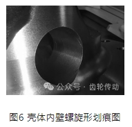 如圖 6所示,在鉸刀磨損較嚴重的后期階段出現了十字孔由內向外劃痕逐漸加深現象,造成孔壁劃痕最直接的原因是積屑瘤問題。要抑制積屑瘤形成或者降低其大小主要考慮控制切削速度、降低進給量、增大刀具角度及使用潤滑性較好的切削液等。在切削用量與刀具使用壽命的關系表達式中表明,切削速度對刀具使用壽命影響最大,進給量次之,背吃刀量影響最小。由于實際加工中,半精鏜工序已經確定了鉸刀的加工余量,最快捷的方法是從降低進給量的方向考慮。