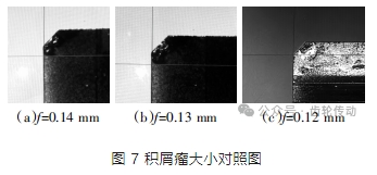 如圖7所示,在進行了3次實驗后,即進給量為每齒0.12 mm的情況下,劃痕消失,積屑瘤最小,核算刀具壽命期內能加工760件,折算成加工長度接近152 m。