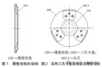 上述薄壁齒輪車工夾具利用三爪卡盤 102 的自定心功能特點,以內(nèi)孔和端面定位方式設(shè)計車削夾具,由于薄壁齒輪 101 在精車加工過程內(nèi)孔、端面和外圓一次裝夾、一次加工,可保證薄壁齒輪 101 內(nèi)外圓的同軸度和端面的垂直度。