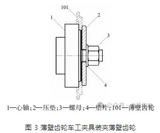 一種薄壁齒輪車工夾具,以提高車工加工后薄壁齒輪的平行度。其結(jié)構(gòu)見圖 3,包括心軸 1、壓墊 2 和螺母 3;心軸 1 包括用于被夾爪 102.1 夾持的夾持段、用于穿過薄壁齒輪內(nèi)孔的定位段以及用于與壓墊 2 和螺母 3 連接的連接段;壓墊 2 的直徑與薄壁齒輪定位孔的內(nèi)徑配合;螺母 3 螺紋連接在心軸 1 的連接段上,將壓墊 2 壓緊在薄壁齒輪定位孔內(nèi),實現(xiàn)定位,壓墊 2 與心軸 1 的定位段將薄壁齒輪 101 夾緊。上述薄壁齒輪車工夾具,還包括位于壓墊 2 和螺母 3 之間的墊片 4,以分散螺母 3 對壓墊 2 的壓力。心軸 1 與薄壁齒輪內(nèi)孔間隙配合,心軸 1 由剛性材料制成。