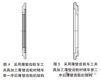 精車第一序時采用寬邊三爪先夾持薄壁齒輪外圓將薄壁齒輪內(nèi)孔車到圖紙要求,且用反車刀將左端面加工到圖紙要求尺寸,作為精車第二序時薄壁齒輪定位孔(見圖 4);精車第二序時將心軸 1 夾在三爪卡盤 102 上找正、夾緊,然后將薄壁齒輪 101 裝在心軸 1 上,裝好壓墊 2,用螺母 3 擰緊后(見圖 3),加工薄壁齒輪 101 兩端面(見圖 5),每次加工完只需松螺母 3 裝夾薄壁齒輪 101,心軸 1 固定在三爪卡盤 102 上不動。