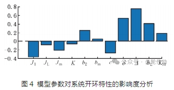 為了分析模型中的參數(shù)對系統(tǒng)特性的影響權(quán)重,對模型參數(shù)進行影響度分析,在 MATLAB/ Simulink中搭建1.1節(jié)建立的雙電機精密傳動機構(gòu)動力學模型,利用靈敏度分析工具箱(sensitivi- tyanalyzer)進行模型參數(shù)的影響度分析。模型中的參數(shù)設置見表1,分析后獲得系統(tǒng)開環(huán)特性的影響度結(jié)果,如圖4所示。