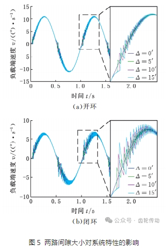 假定軸1行星減速器輸出端齒輪與大齒圈之間的間隙為5′,而軸2的間隙在此基礎上分別加上0′、5′、10′、15′,圖6所示為開環(huán)和速度全閉環(huán)時的仿真結(jié)果。