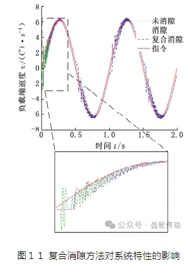 圖11中,藍虛線為未采取消隙措施時的控制效果,綠虛線為加了消隙控制器但未加同步控制器時的控制控制效果,粉虛線為加入本文提出的復合消隙方法時的控制效果。從綠虛線可以看出,加入消隙控制器后,負載端速度除了在啟動階段存在一定的沖擊外,其他時間段的跟蹤誤差明顯減小,在此基礎上加入同步控制器后,在保證了跟蹤精度的同時,消除了啟動階段系統(tǒng)的沖擊現(xiàn)象,提高了系統(tǒng)的穩(wěn)定裕度。