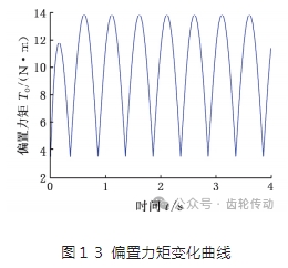 本文設計的消隙控制器中,兩電機的偏置力矩大小只與速度參考指令相關(guān),不失一般性,以速度指令2πsin 2πt為例,根據(jù)圖8所示搭建的消隙控制模塊,得到的偏置力矩信號如圖13所示。可以看出,偏置力矩的變化范圍在3.5~14N·m 之間,由于消隙控制器輸出的偏置力矩以相反的方向施加于速度控制器輸出端(圖8),故兩個小齒輪的偏置力矩始終保持方向不變且相反。