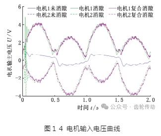 圖14所示為兩個電機的實際輸入電壓信號曲線,未消隙時,電機電壓在-1~1V 之間變化,電機的出力方向發(fā)生變化,因此,系統(tǒng)將受到間隙的影響。本文提出的消隙控制器則保證了一個電 機電壓恒為正,另一個電機電壓恒為負,說明兩個電機的出力方向始終保持不變且相反,并且電機出力可以克服系統(tǒng)靜摩擦,保證兩個小齒輪與大齒圈保持接觸,驗證了本文提出的消隙控制器可實現(xiàn)間隙的完全消除。