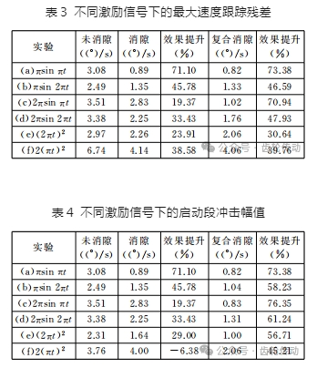 實驗結(jié)果表明,采用復合消隙方法后,兩個電機的出力方向始終保持不變且方向相反,偏置力矩最小值仍可以克服系統(tǒng)靜摩擦,達到了完全消除間隙的目的;在不同的激勵信號下,采取復合消隙方法時,系統(tǒng)速度跟蹤殘差的抑制效果最大可達73.38%,而啟動階段的沖擊幅值衰減效果最大可達76.35%,驗證了復合消隙方法的優(yōu)越性。研究成果為雙電機精密傳動機構(gòu)的高精度高動態(tài)控 制方法研究和實際工程應用提供了理論基礎與技術(shù)支撐。