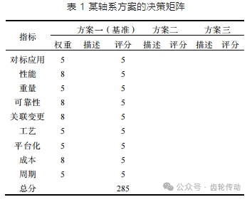 1)對標應用:評估行業內標桿的、成熟的應用;2)性能:評估傳動系統的階次偏離度、重合度、軸系撓度、嚙合錯位、傳遞誤差、效率等;3)重量:評估整個方案的重量差異,應包含關聯部件的重量;4)可靠性:評估安全系數、軸承損傷率、最大應力等;5)關聯變更:評估更改可能引起其他零件的性能、強度、接口和空間的匹配;6)工藝:評估零件加工生產工藝的可行性和裝配工藝的可行性;7)平臺化:評估當前設計方案的通用性;8)成本:評估方案的總體成本,包括零件自身變化帶來的成本變更,以及關聯變更帶來的成本變更,裝配工藝的成本變更,可能產生的修模費用和報廢費用;9)周期:評估方案的生產制造周期,驗證周期是否能夠滿足項目要求。具體決策矩陣如表 1 所示。